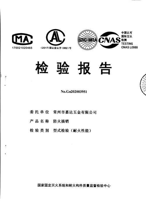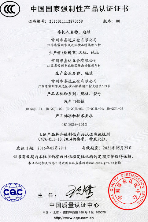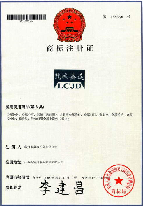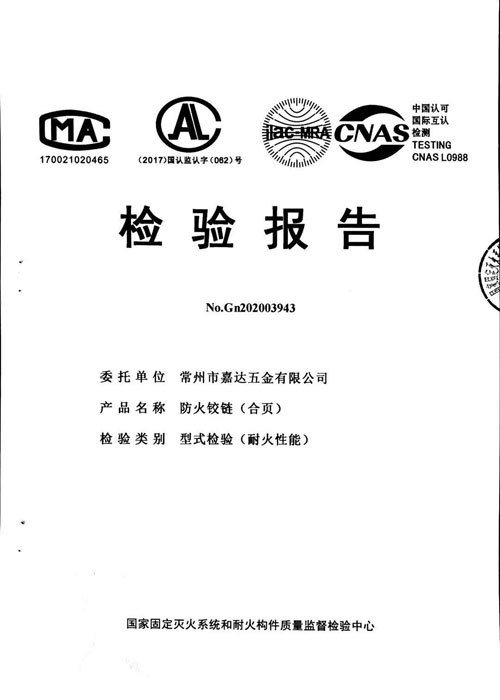 常州市嘉達(dá)五金有限公司是專業(yè)生產(chǎn)不銹鋼防火、防盜合頁、銅手拉門、銅門鉸鏈、銅花和各種不銹鋼暗插銷的企業(yè).最近又成功開發(fā)承重鉸鏈以及調(diào)節(jié)門縫可調(diào)式鉸鏈.同時(shí)引進(jìn)澳大利亞技術(shù)開發(fā)各種鋁合金透氣百頁窗,遠(yuǎn)銷歐美市場. 我司占地面積25000平方米,建筑面積12000平方米;固定資產(chǎn)1200萬元,公司設(shè)備齊全,設(shè)計(jì)獨(dú)特,檢測一流,產(chǎn)品適用于高級防火門以及現(xiàn)代高層居室、艦船門的配套,也適應(yīng)于一般居民.產(chǎn)品經(jīng)"天津國家固定滅火系列和耐火構(gòu)件質(zhì)量監(jiān)督檢驗(yàn)中心"檢驗(yàn)合格. 公司重視產(chǎn)品質(zhì)量,重視產(chǎn)品開發(fā)創(chuàng)新.目前已建立完整的質(zhì)量管理體系:通過ISO9001:2000質(zhì)量認(rèn)證體系和中國強(qiáng)制認(rèn)證3C認(rèn)證.產(chǎn)品曾獲國家知識產(chǎn)權(quán)局"中國專利技術(shù)博覽會"金獎(jiǎng)、獲得"企業(yè)資信等級AAA級"、"信用(合同)AAA級企業(yè)"、"中國檢驗(yàn)協(xié)會會員"、"中國電器照明協(xié)會委員"、"中國工商協(xié)會委員"、"首批國家質(zhì)量服務(wù)信得過單位"、"常州市文明單位"及"武進(jìn)區(qū)文明單位"的稱號. 公司的經(jīng)營宗旨是"以顧客為中心、以質(zhì)量為市場、以創(chuàng)新求發(fā)展、以管理求效益". 公司將一如既往,以一流的產(chǎn)品質(zhì)量,誠心周到的服務(wù)使顧客滿意,以更好的服務(wù)于客戶.