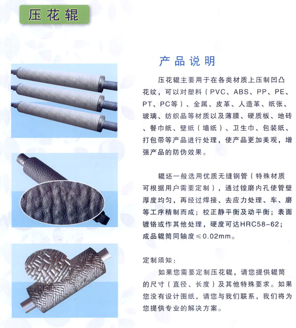 常州市武進(jìn)區(qū)禮嘉鎮(zhèn)萬(wàn)超機(jī)械有限公司專業(yè)生產(chǎn)、加工花輥、鏡面輥、無(wú)紡布設(shè)備,及各類機(jī)械配件。產(chǎn)品廣泛應(yīng)用于金屬、塑料、皮革、紙張、玻璃、木材、無(wú)紡布、衛(wèi)生材料、包裝裝潢等行業(yè)。