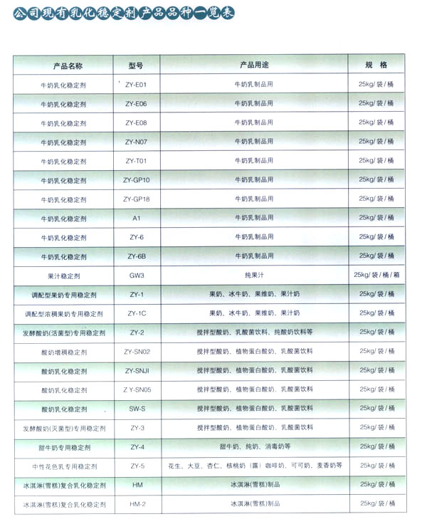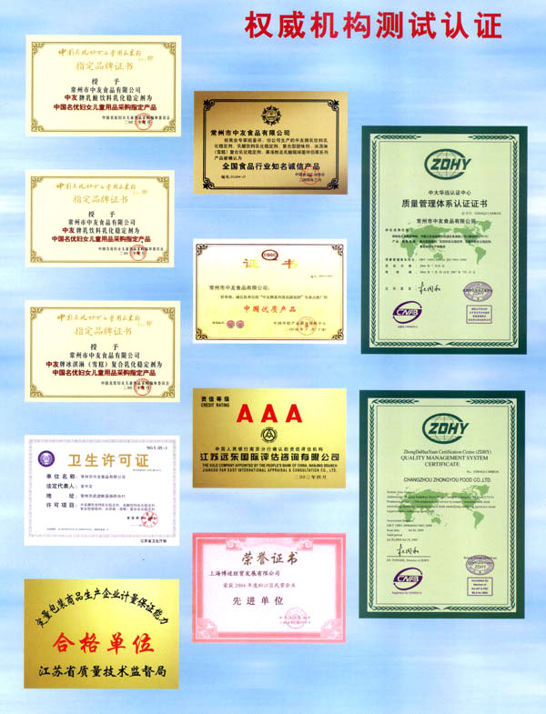 常州市中友食品有限公司;匚挥诔V菔袞|郊開發(fā)區(qū),廠房占地面積6000平方米,擁有全新的生產(chǎn)線,先進(jìn)的生產(chǎn)流程和嚴(yán)格的質(zhì)量管理體系(工廠已通過IS09001:2000質(zhì)量管理體系的認(rèn)證)。并有專業(yè)的技術(shù)開發(fā)和理化檢驗的設(shè)施、經(jīng)驗豐富的技術(shù)人員。公司以科技為依托,常年與高等院校合作,不斷地開發(fā)和研制適合市場需求的食品添加劑系列產(chǎn)品。公司每年面向全國招收優(yōu)秀的博士、碩士及優(yōu)秀的大學(xué)生。公司現(xiàn)有員工1 00多人,管理人員2 0名、高工5名、產(chǎn)品專業(yè)技術(shù)開發(fā)人員12名,還有選擇地引進(jìn)和代理國內(nèi)外各種適用的食品添加劑。 依靠本公司雄厚的科技力量和先進(jìn)的科技設(shè)備,生產(chǎn)基地已經(jīng)具備了與客戶共同開發(fā)國內(nèi)外先進(jìn)食品添加劑的應(yīng)用技術(shù)。博適中友公司多年來致力于食品添加劑的研究和開發(fā),突破常規(guī)理念,以市場、用戶為中心,研究開發(fā)各個品種、各個檔次的食品添加劑,品種齊全又多樣,既有出口型又有內(nèi)銷型。公司主要穩(wěn)定劑產(chǎn)品有:乳飲料乳化穩(wěn)定劑、乳酸飲料乳化穩(wěn)定劑、冰淇淋(雪糕)復(fù)合乳化穩(wěn)定劑、果汁飲料乳化穩(wěn)定劑等,產(chǎn)品暢銷國內(nèi)外,覆蓋了全國二十多個省市,并建立了穩(wěn)定的銷售網(wǎng)絡(luò)。 本公司對產(chǎn)品指定了嚴(yán)格的質(zhì)量標(biāo)準(zhǔn),并報請常州市技術(shù)檢驗監(jiān)督局審核批準(zhǔn),其技術(shù)要求完全符合GB一2760(食品添加劑使用衛(wèi)生標(biāo)準(zhǔn))和符合聯(lián)合國直接衛(wèi)生組織(WHO)、聯(lián)合國食品與農(nóng)業(yè)組織(FAO)以及美國食品和藥物管理局的有關(guān)規(guī)定。 長期以來,博適中友公司以市場定位為基本依據(jù),堅持發(fā)展并開辟多元化的國內(nèi)外市場:以專業(yè)化、長遠(yuǎn)化、規(guī);癁榻(jīng)營思路:以開拓創(chuàng)新,務(wù)實誠信為經(jīng)營理念,不斷促進(jìn)企業(yè)發(fā)展壯大。 公司自創(chuàng)建以來,始終不渝地堅持質(zhì)量第一、信譽至上,以精湛的工藝加工產(chǎn)品,不管是標(biāo)準(zhǔn)的或特制的都可享有本公司優(yōu)良的技術(shù)服務(wù)。無論您需要何種功能性添加劑,博適中友食品添加劑公司均能滿足您的要求。博適中友公司以價格合理、服務(wù)周到為經(jīng)營宗旨,努力引導(dǎo)食品添加劑應(yīng)用發(fā)展的新潮流、新方向。在才能卓越的領(lǐng)導(dǎo)者的帶領(lǐng)下,全體員工以開拓、創(chuàng)新、求實、守信為企業(yè)精神,不斷地提高自身的素質(zhì)。 公司的宗旨是“開拓創(chuàng)新發(fā)展、精誠服務(wù)和諧”為目標(biāo),熱忱與各界有識之士攜手共進(jìn),共創(chuàng)輝煌!如今公司業(yè)務(wù)蒸蒸日上,專業(yè)技術(shù)研究越走越精,這都與廣大客戶大力支持分不開。在新世紀(jì)來臨之際,上海博適中友公司愿與您真誠合作,攜手并進(jìn),共鑄新的輝煌!