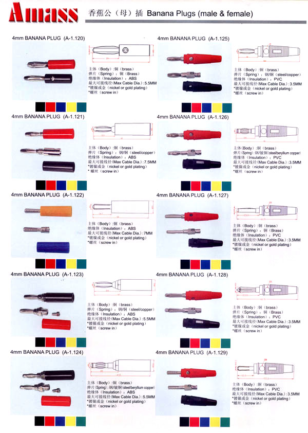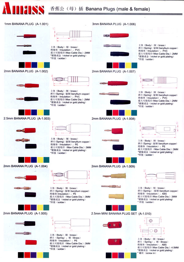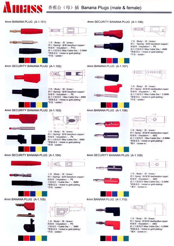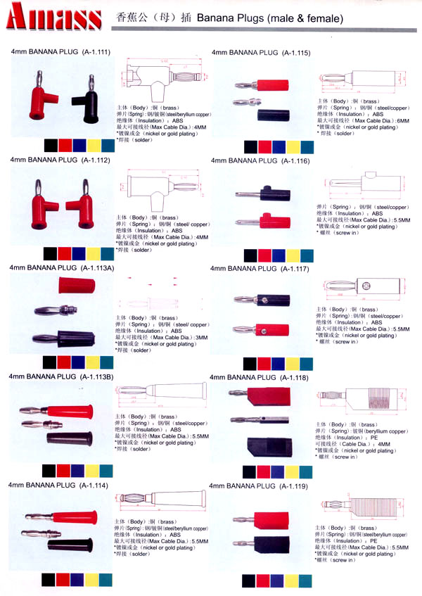 本公司專業(yè)生產(chǎn)各類香蕉插頭,香蕉插座,接線柱,電瓶夾,鱷魚夾,測試導(dǎo)線,測試筆等。產(chǎn)品分2mm/2.5mm/3mm/3.5mm/4mm五大系列,百余種款式, 各種香蕉插廣泛用于儀器、儀表、電力測試、教學(xué)、玩具,視聽設(shè)備、醫(yī)療儀器,保健產(chǎn)品等領(lǐng)域。公司技術(shù)力量雄厚,生產(chǎn)工藝先進(jìn),產(chǎn)品遠(yuǎn)銷港、臺、歐美,并與飛利浦等國際品牌配套。公司本著精益求精的理念,歡迎新老客戶光臨。       我們擁有資深的工程師和豐富的電子產(chǎn)品銷售經(jīng)驗(yàn),專業(yè)生產(chǎn)各類電子接插件產(chǎn)品。 香蕉插頭,香蕉插座,電瓶夾,鱷魚夾等品種齊全、 質(zhì)量可靠,致力服務(wù)于通訊、數(shù)據(jù)通信、消費(fèi)類電子產(chǎn)品、計(jì)算機(jī)和計(jì)算機(jī)外圍設(shè)備以及工業(yè)應(yīng)用等領(lǐng)域,能給客戶提供全面采購解決方案。       我們秉承穩(wěn)健作風(fēng)、誠實(shí)經(jīng)營、合理價(jià)格、完善服務(wù)的宗旨,在全體客戶的支持下,公司不斷創(chuàng)新進(jìn)取,業(yè)績蒸蒸日上,已與數(shù)十家電子零件制造商及其分支機(jī)構(gòu)建立密切合作關(guān)系,在國內(nèi)擁有數(shù)百家固定客戶。