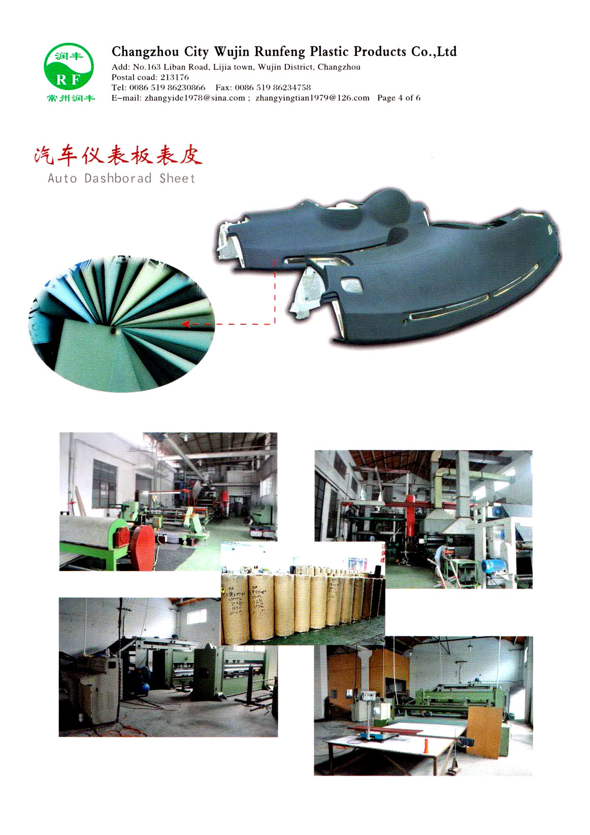 常州市武進(jìn)潤(rùn)豐塑料制品有限公司地處風(fēng)景美麗經(jīng)濟(jì)發(fā)達(dá)的長(zhǎng)江三角洲常州市東郊禮嘉鎮(zhèn),公司占地面積約8000平方米,且地理位置優(yōu)越,是中外客商常涉之地。        本公司專業(yè)生產(chǎn)汽車儀板軟化表皮、PVC門護(hù)板表皮、PVC復(fù)合制品、壓延薄膜制品,(塑料制品除醫(yī)用塑料制品),車輛零部件,機(jī)械電器零部件,電子元件,沖壓件制造,加工無(wú)妨制品,玻纖氈(GFP板),麻氈板等。本公司的產(chǎn)品在國(guó)內(nèi)一線乘用車上廣泛使用。產(chǎn)品通過(guò)國(guó)家汽車質(zhì)量監(jiān)督檢驗(yàn)中心檢測(cè),并取得了各種證書(shū),如亞瑟國(guó)際認(rèn)證;ISO/TS1694:2009等。        本公司技術(shù)力量雄厚,生產(chǎn)設(shè)備先進(jìn)。多年來(lái),建立了較完善的質(zhì)量管理體系,以先進(jìn)的檢測(cè)技術(shù),優(yōu)質(zhì)的服務(wù)態(tài)度,向客戶提供最優(yōu)秀的產(chǎn)品,在同行中享有良好的聲譽(yù)。        歡迎新老客戶來(lái)公司指導(dǎo),洽談,合作。