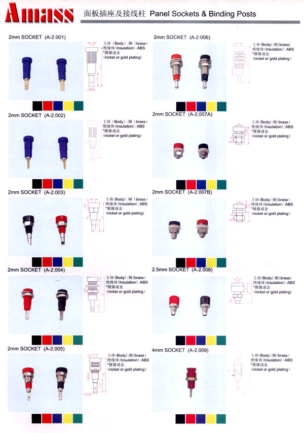 本公司專業(yè)生產(chǎn)各類香蕉插頭,香蕉插座,接線柱,電瓶夾,鱷魚夾,測(cè)試導(dǎo)線,測(cè)試筆等。產(chǎn)品分2mm/2.5mm/3mm/3.5mm/4mm五大系列,百余種款式, 各種香蕉插廣泛用于儀器、儀表、電力測(cè)試、教學(xué)、玩具,視聽設(shè)備、醫(yī)療儀器,保健產(chǎn)品等領(lǐng)域。公司技術(shù)力量雄厚,生產(chǎn)工藝先進(jìn),產(chǎn)品遠(yuǎn)銷港、臺(tái)、歐美,并與飛利浦等國(guó)際品牌配套。公司本著精益求精的理念,歡迎新老客戶光臨。