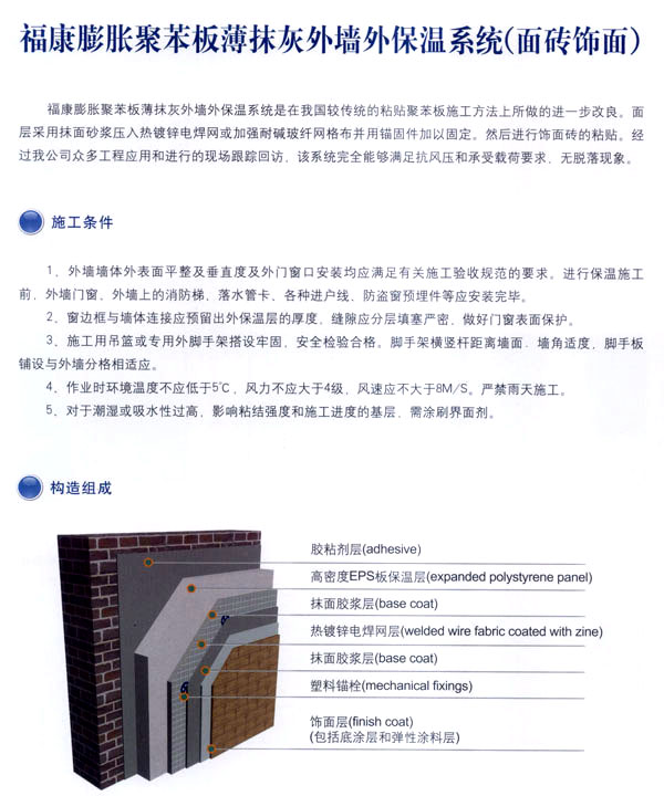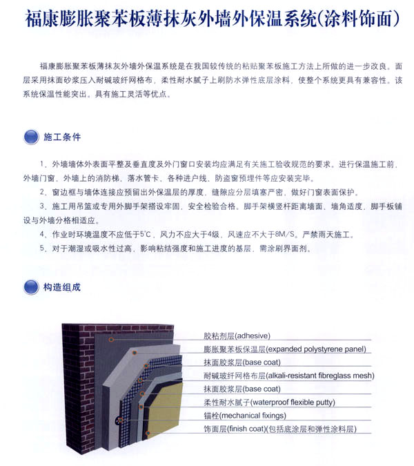 常州市福康新型建材有限公司是以研制開發(fā)、生產(chǎn)、銷售、施工、技術(shù)服務(wù)為一體的化學(xué)建筑材料的專業(yè)企業(yè),通過與歐洲著 名建筑材料公司和國內(nèi)權(quán)威科研機構(gòu)合作,并聘請國家級專家為技術(shù)顧問,開發(fā)出適合我國市場的?礒PS、XPS及聚苯顆粒外墻外保溫節(jié)能系統(tǒng)。          公司的生產(chǎn)線全部采用國內(nèi)先進的電腦控制自動化設(shè)備,配備了專業(yè)的實驗中心,并且采用進口的可再分散乳膠粉為基料,確保?低鈮ν獗毓(jié)能系統(tǒng)具有性能優(yōu)異、安全可靠,綠色環(huán)保、適用性強的高品質(zhì)特點。             公司開發(fā)的\'福康外墻外保溫系統(tǒng)\'被列為江蘇省科技成果推廣項目。整個生產(chǎn)流程依照質(zhì)量體系的要求,實行嚴格的監(jiān)控和檢測,為生產(chǎn)優(yōu)質(zhì)產(chǎn)品提供保證。高品質(zhì)的?低鈮ν獗叵到y(tǒng),提供從熱工設(shè)計、產(chǎn)品開發(fā)、生產(chǎn)銷售及工程施工全程服務(wù)的一體化解決方案。          公司本著“綠色環(huán)保、節(jié)約能源、造福人類”的理念。用我們一流的產(chǎn)品和優(yōu)秀的服務(wù),打造出一個個節(jié)能康居示范工程,為人類營造出舒適健康的居住環(huán)境。我們愿為中國節(jié)能事業(yè)的發(fā)展積極努力,更上一層樓。         公司組建高效的生產(chǎn)經(jīng)營管理模式,設(shè)立專業(yè)技術(shù)服務(wù)機構(gòu)。配備售后的優(yōu)質(zhì)服務(wù)。實行原材料、運輸、安裝一條龍服務(wù)。經(jīng)本公司施工之后,貴公司可以直接批涂料、裝門窗、貼瓷磚,保證絕無任何質(zhì)量問題。