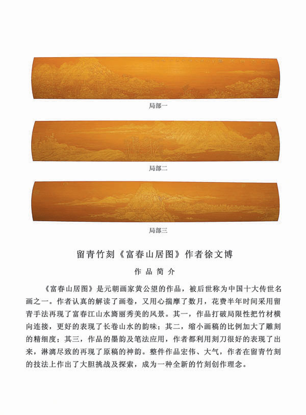 徐博(藝名文博),1973年生,江蘇武進(jìn)人,江蘇省省名人,高級(jí)工藝美術(shù)師,常州市留青竹刻非遺傳承人,常州工藝美術(shù)家協(xié)會(huì)理事,被譽(yù)為當(dāng)今中國最具創(chuàng)新意識(shí)的新銳竹刻家代表,多次獲得國家工藝美術(shù)大獎(jiǎng)。酷愛留青竹刻的徐文博賞竹為樂,以竹詠志,借竹抒懷,悉心探索留青竹刻的藝術(shù)表現(xiàn)。在中國工藝美術(shù)大師蕭劍波的精心指導(dǎo)下,開創(chuàng)留青水墨山水之技法,更好的體現(xiàn)了竹刻淡雅清秀的藝術(shù)風(fēng)格,并不斷汲取書畫、攝影、雕塑等藝術(shù)精華,不斷滋養(yǎng)藝術(shù)情趣,提升擴(kuò)展胸襟人格的同時(shí)也逐步形成了其形神兼?zhèn),虛?shí)相生,氣韻生動(dòng)的藝術(shù)特點(diǎn),作品為眾多的國內(nèi)外收藏家珍藏。