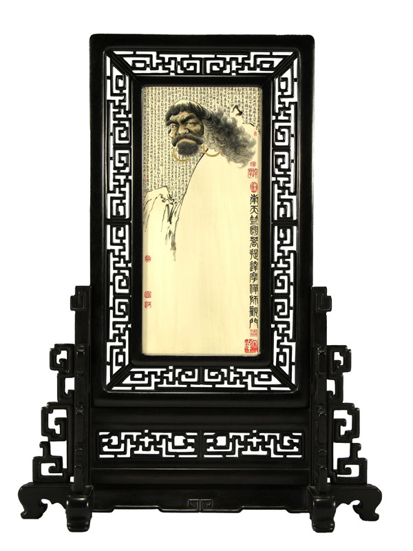 2牙刻《回眸》傳神的刻畫了達摩禪師回眸間投來的眼神,就像一位飽經(jīng)風霜的老者,有幾經(jīng)坎坷的人生故事向你訴說,有多少世態(tài)炎涼人生哲理向你傳遞;仨g風中飄逸的須發(fā)、寬聳的鼻梁、緊鎖的眉頭,乃至畫面中作者極力奉獻給觀者的、達摩那炯炯有神的眼睛,像大海那么寬廣、像宇宙那么深遂。畫面背景銘刻達摩相關(guān)禪的精辟論著,更顯佛的天國,禪的意境。幾枚大小相間的朱紅印章散發(fā)幾分文雅氣息。人物的須發(fā)看似瀟灑的筆墨一揮而就,其實借助放大鏡看去烏黑發(fā)亮、密密層層的須發(fā)根根可數(shù)、飄逸迷人。既突出筆墨與刀法,又凸顯內(nèi)涵與精神,是作者勤于雕刻而又修煉于雕刻之外的結(jié)晶。 此作獲首屆中國華東工藝美術(shù)精品展特等金獎,為中國工藝美術(shù)館珍藏。