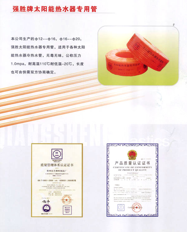 本公司是改革開放初期成立的獨資私營企業(yè)。二十余年來,本廠在尊重 科學(xué)、尊重人才、加強技改、狠抓管理的基礎(chǔ)上使企業(yè)不斷地發(fā)展壯大。目前,本廠擁有22條先進水平地單螺桿擠出機生產(chǎn)線,2條生產(chǎn)大口徑PP管地生產(chǎn)線,8臺電腦注塑機,以及全套精密地檢測設(shè)備和高素質(zhì)地檢測人員,確保了產(chǎn)品質(zhì)量。年生產(chǎn)能力達6000噸,成為各種塑料管道地專業(yè)生產(chǎn)廠家。   我們的主要產(chǎn)品有: 給水用三型聚丙烯(PP-R)管材、管件;PE高密度聚乙烯(HDPE)管材;PE低密度聚乙烯(LLDPE)管材;PP聚乙烯管材;強勝牌太陽能熱水器專用管。   產(chǎn)品廣泛用于城鄉(xiāng)水改、郵電通信、高壓供電、市政改造、路燈管理、鑿井挖泥、航道疏竣、選礦尾砂填充、環(huán)保、化工、輕工等行業(yè)。   本廠生產(chǎn)的各類管材及管件,吸收國內(nèi)外同類產(chǎn)品的精華,設(shè)計先進,結(jié)構(gòu)合理,選料科學(xué),質(zhì)量執(zhí)行國家標(biāo)準(zhǔn),產(chǎn)品歷年經(jīng)國家塑料制品質(zhì)量監(jiān)督檢驗中心檢驗合格。   我們始終秉承“以人品塑造產(chǎn)品”的理念,以科學(xué)提升品質(zhì)、與時俱進,以強大的研發(fā)能力,高質(zhì)量的提供新型的環(huán)保產(chǎn)品,回報社會各界的支持!