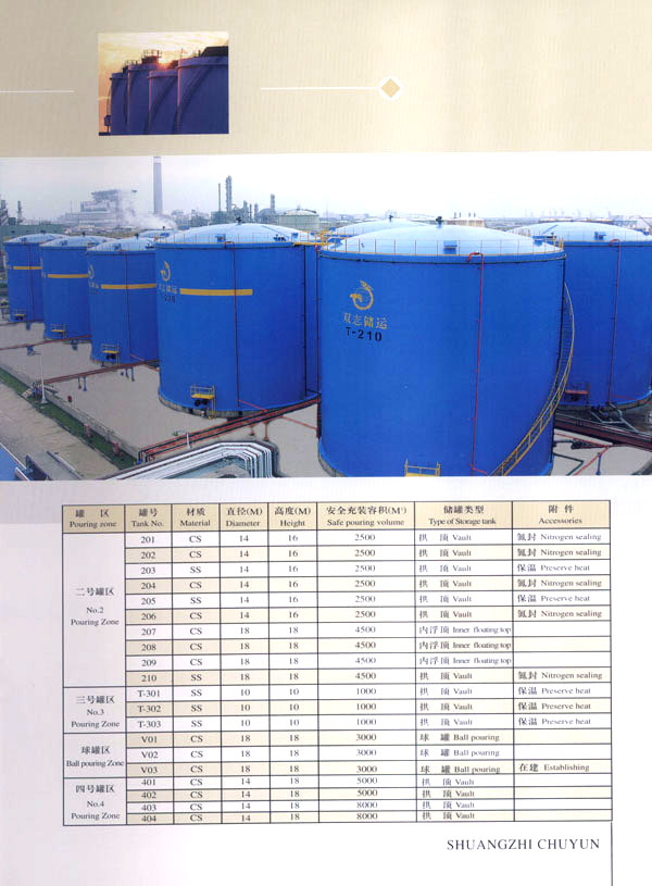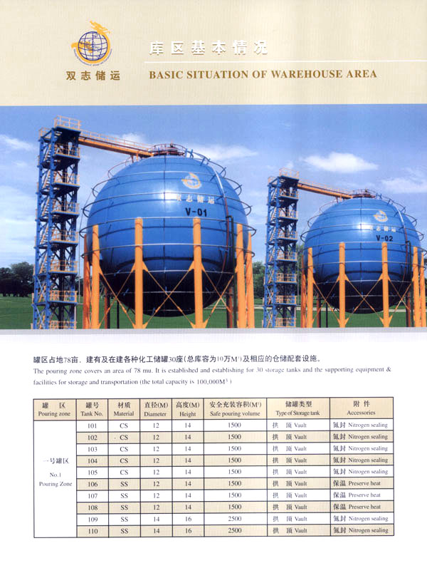 常州市雙志石油化工儲運有限公司,位于國家一類對外開放口岸常州石化港區(qū),是一家專業(yè)石油化工產(chǎn)品倉儲公司。罐區(qū)占地78畝,建有各種化工儲罐30座(總庫容為10萬m3)及相應的倉儲配套設(shè)施。經(jīng)海關(guān)批準,設(shè)有海關(guān)保稅庫和海關(guān)監(jiān)管庫。公司專業(yè)從事石油化工產(chǎn)品倉儲、中轉(zhuǎn)、分撥、灌裝業(yè)務(wù),以及進出口貨物的代理報關(guān)、接受金融機構(gòu)委托提供動產(chǎn)質(zhì)押監(jiān)管服務(wù)。