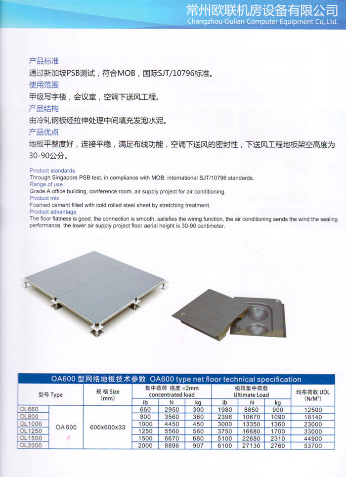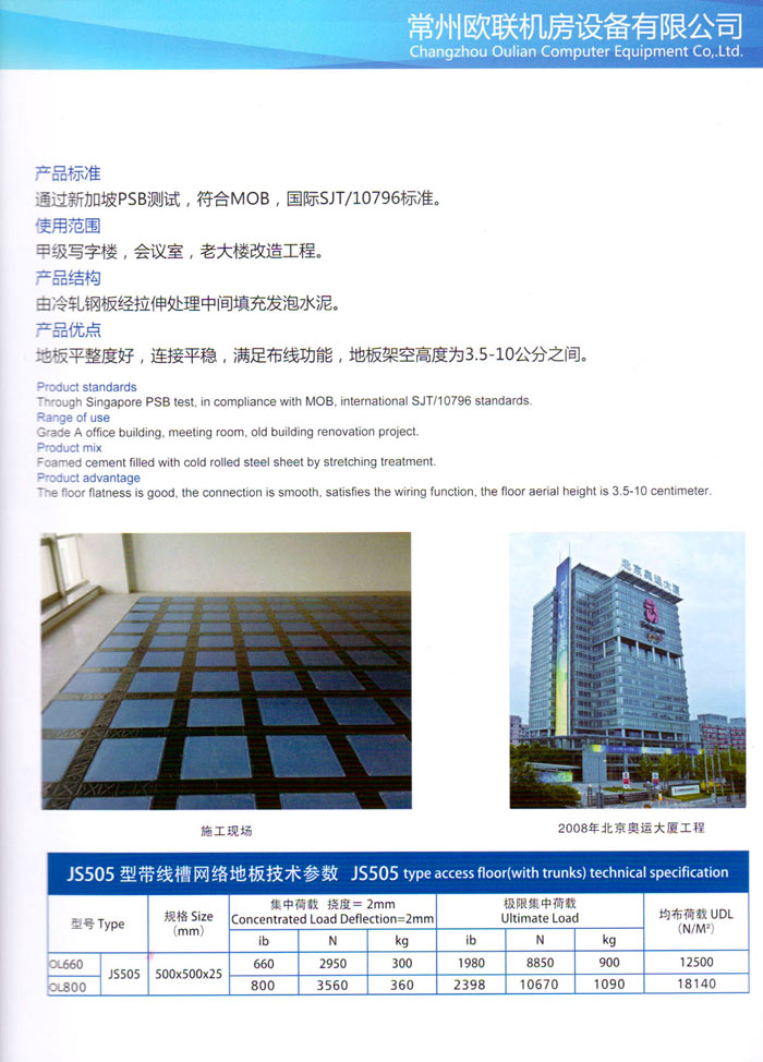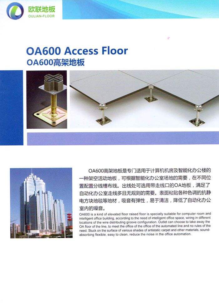 防靜電高架活動(dòng)地板、全鋼地板、陶瓷地板是計(jì)算機(jī)行業(yè)發(fā)展起來的新型鋪地材料,隔離了潮氣、靜電灰塵,最重要的是解決了綜合布線問題,無需預(yù)埋管線,可隨時(shí)拆卸、搬移,保證了資訊設(shè)備完整的優(yōu)點(diǎn),適應(yīng)了智能化樓宇中信息自動(dòng)化技術(shù)對所處環(huán)境的特定要求,避免了廣大客戶的雙重投資,使現(xiàn)代化辦公程度更加高效,辦公場所更加舒適。 “歐聯(lián)”系列全鋼地板,符合國家安全要求,種類完備多樣,其中防靜電陶瓷地板、硫酸鈣地板等除具有普通瓷質(zhì)的裝飾和實(shí)用性外,其耐磨、防水、防火功能優(yōu)于其它同類產(chǎn)品,防靜電系列地板,能切合不同客戶的要求,其靈活的配置,深受客戶歡迎,不同材質(zhì)的地板結(jié)構(gòu)使設(shè)計(jì)師的設(shè)計(jì)空間比傳統(tǒng)的更加廣闊自由和善變。 公司大力發(fā)展國內(nèi)外銷售業(yè)務(wù),多次中標(biāo)國內(nèi)重點(diǎn)工程 ,例:哈爾濱醫(yī)科大學(xué)、山東大學(xué)、上海普通機(jī)場等。 公司將一如既往開發(fā)和制造一流的產(chǎn)品,愿與廣大有識之士合作發(fā)展,共創(chuàng)美好未來。