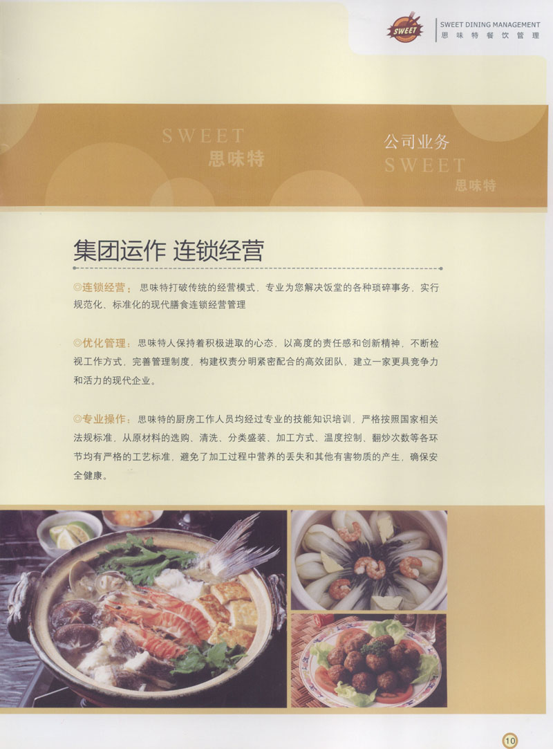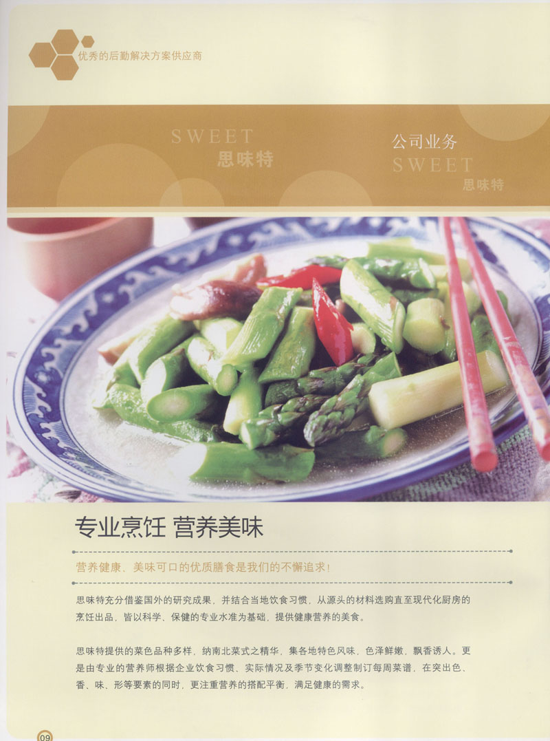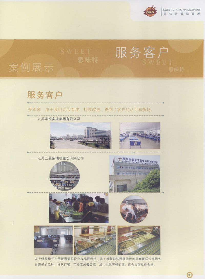 常州市思味特餐飲有限公司是一家專業(yè)從事企事業(yè)后勤服務的有限責任公司,公司從承包食堂起步,逐漸發(fā)展為經營團膳承包、營養(yǎng)送餐、生活區(qū)管理、連鎖餐廳的綜合型企業(yè)。2008年公司斥資100萬元,在常州興建了可以同時提供3000餐膳食的中央廚房,重點打造“和美客”后勤服務品牌,全力為企事業(yè)單位解決后勤后顧之憂。 到目前為止,我們合作成功的企事業(yè)單位超過50多家,服務人數(shù)突破15萬,合作單位包括國家機關、國有企業(yè)、三資企業(yè)、民營企業(yè)、學校、醫(yī)院等,其中不乏國際知名品牌公司。 和美客愿為更多的國內外企事業(yè)單位及機關團體分憂解難,從廚房設計、菜品配送、團膳承包、到生活區(qū)管理等提供全方位的服務。