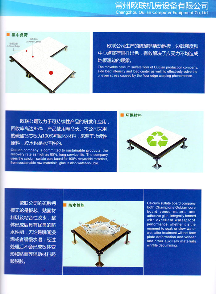 防靜電高架活動地板、全鋼地板、陶瓷地板是計(jì)算機(jī)行業(yè)發(fā)展起來的新型鋪地材料,隔離了潮氣、靜電灰塵,最重要的是解決了綜合布線問題,無需預(yù)埋管線,可隨時(shí)拆卸、搬移,保證了資訊設(shè)備完整的優(yōu)點(diǎn),適應(yīng)了智能化樓宇中信息自動化技術(shù)對所處環(huán)境的特定要求,避免了廣大客戶的雙重投資,使現(xiàn)代化辦公程度更加高效,辦公場所更加舒適。 “歐聯(lián)”系列全鋼地板,符合國家安全要求,種類完備多樣,其中防靜電陶瓷地板、硫酸鈣地板等除具有普通瓷質(zhì)的裝飾和實(shí)用性外,其耐磨、防水、防火功能優(yōu)于其它同類產(chǎn)品,防靜電系列地板,能切合不同客戶的要求,其靈活的配置,深受客戶歡迎,不同材質(zhì)的地板結(jié)構(gòu)使設(shè)計(jì)師的設(shè)計(jì)空間比傳統(tǒng)的更加廣闊自由和善變。 公司大力發(fā)展國內(nèi)外銷售業(yè)務(wù),多次中標(biāo)國內(nèi)重點(diǎn)工程 ,例:哈爾濱醫(yī)科大學(xué)、山東大學(xué)、上海普通機(jī)場等。 公司將一如既往開發(fā)和制造一流的產(chǎn)品,愿與廣大有識之士合作發(fā)展,共創(chuàng)美好未來。