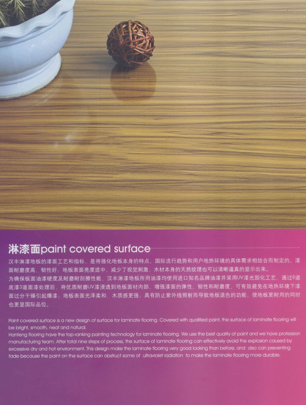 常州漢豐裝飾材料有限公司是一家涉及強(qiáng)化地板制造、屏風(fēng)鋁材生產(chǎn)、進(jìn)出口貿(mào)易的大型公司。2001年公司投入重資.全面引進(jìn)世界頂級(jí)一體化自動(dòng)流水生產(chǎn)線和具有國際先進(jìn)水準(zhǔn)的德國權(quán)威木地板生產(chǎn)技術(shù),興建強(qiáng)化地板生產(chǎn)基地。多年以來.一直不斷加強(qiáng)生產(chǎn)設(shè)備、廠房基礎(chǔ)投入,目前公司年生產(chǎn)強(qiáng)化地板能力已經(jīng)達(dá)到了500萬平方米,步入國內(nèi)一流行列,具備了雄厚的國際競(jìng)爭(zhēng)力。        漢豐地板以奉獻(xiàn)生活中最完美的地板為發(fā)展目標(biāo),時(shí)尚流行的設(shè)計(jì)風(fēng)格和多樣化的產(chǎn)品類型,贏得了市場(chǎng)的廣泛贊譽(yù)和肯定。產(chǎn)品嚴(yán)格按照歐洲標(biāo)準(zhǔn)檢測(cè)強(qiáng)化木地板的各項(xiàng)性能指標(biāo).達(dá)到百分百的國際技術(shù)標(biāo)準(zhǔn),確保了每一塊地板都有著上乘品質(zhì),是綠色環(huán)保的好地板。并先后通過了Isc)9001國際質(zhì)量管理體系認(rèn)證,IS014001國際環(huán)境管理體系認(rèn)證.中國環(huán)境標(biāo)志產(chǎn)品認(rèn)證,深得用戶的一致好評(píng),是寫字樓、商場(chǎng)、大型超市、學(xué)校、建筑樓宇、娛樂場(chǎng)所、家用私宅等鋪裝的首選地板。