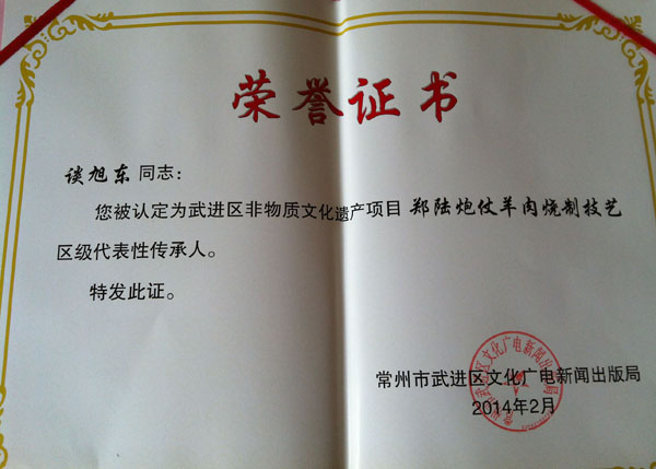 談家的羊肉館位于鄭陸老街上,深秋的一天,記者來(lái)到這家羊肉館,穿過大堂走到廚房里,幾名工人正在忙著處理羊肉。余菊華穿著大紅色的薄毛衣,坐在桌子旁,正在麻利地剔著羊肉上的肥油。她是羊肉館的老一代老板娘,如今和老伴談仲興一起,仍天天來(lái)店里幫著兒子談旭東打下手。余阿姨隨手拿過一塊長(zhǎng)方形的肉皮,用一把小刮刀撳在上面,輕輕地刮著,一團(tuán)團(tuán)白白的油被剔了下來(lái),堆在一邊!拔壹业难蛉馀酶蓛舻模壬系姆嗜膺有筋筋拉拉的東西,全都要弄掉,就是自己家買了豬肉燒紅燒肉,也不可能弄到這么干凈的。現(xiàn)在的客人都怕胖,所以一定要處理得干干凈凈!庇喟⒁陶f(shuō)。剔好的肉皮是用來(lái)熬成皮凍然后混和著羊肉壓制成羊糕的,只有清理得干凈,沒有一點(diǎn)雜質(zhì),羊糕的質(zhì)量才會(huì)好。