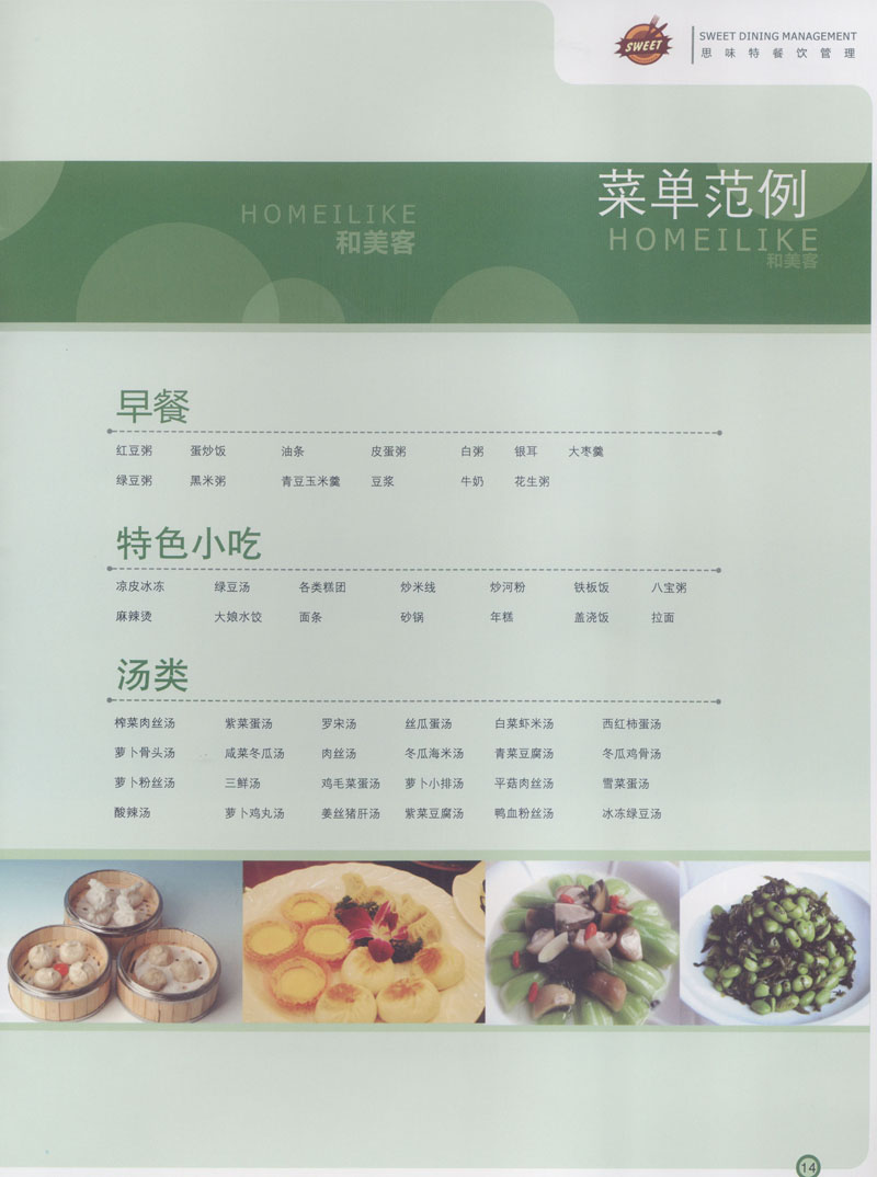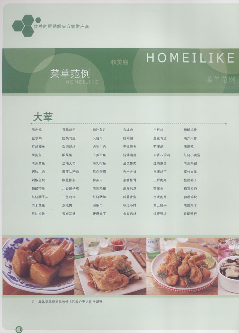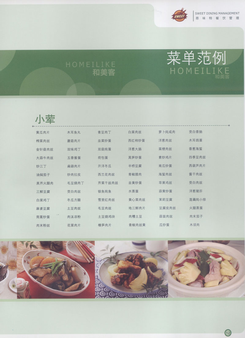 常州市思味特餐飲有限公司是一家專業(yè)從事企事業(yè)后勤服務(wù)的有限責(zé)任公司,公司從承包食堂起步,逐漸發(fā)展為經(jīng)營團(tuán)膳承包、營養(yǎng)送餐、生活區(qū)管理、連鎖餐廳的綜合型企業(yè)。2008年公司斥資100萬元,在常州興建了可以同時提供3000餐膳食的中央廚房,重點(diǎn)打造“和美客”后勤服務(wù)品牌,全力為企事業(yè)單位解決后勤后顧之憂。 到目前為止,我們合作成功的企事業(yè)單位超過50多家,服務(wù)人數(shù)突破15萬,合作單位包括國家機(jī)關(guān)、國有企業(yè)、三資企業(yè)、民營企業(yè)、學(xué)校、醫(yī)院等,其中不乏國際知名品牌公司。 和美客愿為更多的國內(nèi)外企事業(yè)單位及機(jī)關(guān)團(tuán)體分憂解難,從廚房設(shè)計(jì)、菜品配送、團(tuán)膳承包、到生活區(qū)管理等提供全方位的服務(wù)。