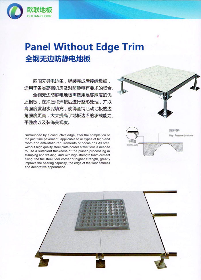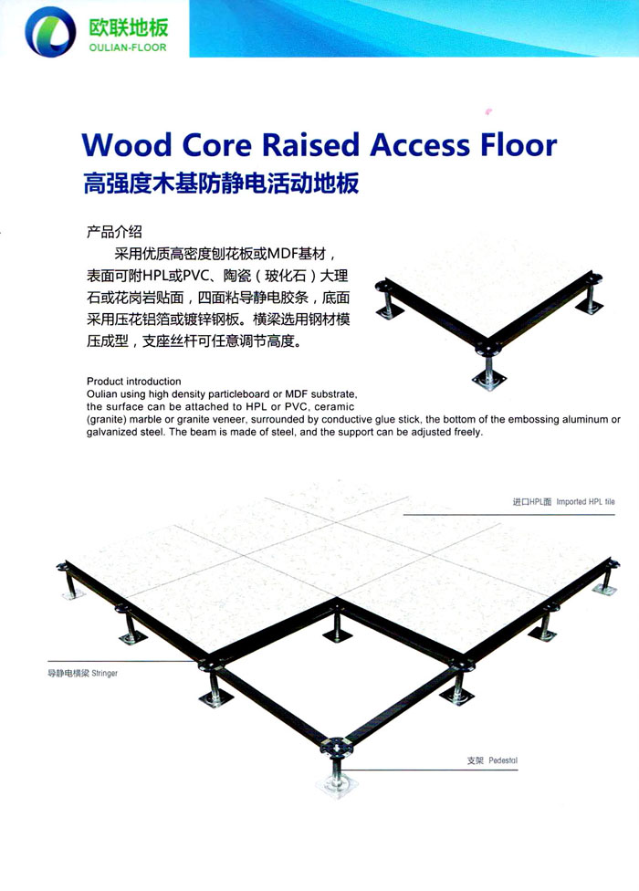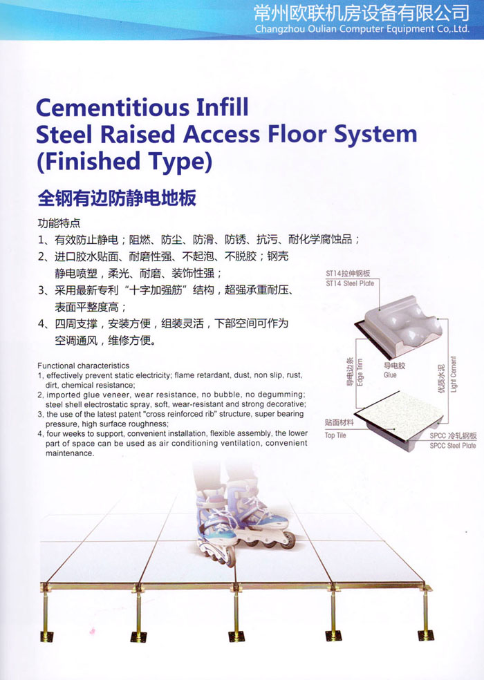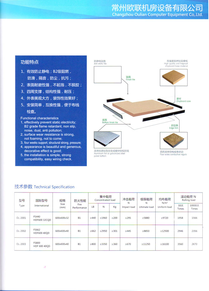 防靜電高架活動(dòng)地板、全鋼地板、陶瓷地板是計(jì)算機(jī)行業(yè)發(fā)展起來(lái)的新型鋪地材料,隔離了潮氣、靜電灰塵,最重要的是解決了綜合布線(xiàn)問(wèn)題,無(wú)需預(yù)埋管線(xiàn),可隨時(shí)拆卸、搬移,保證了資訊設(shè)備完整的優(yōu)點(diǎn),適應(yīng)了智能化樓宇中信息自動(dòng)化技術(shù)對(duì)所處環(huán)境的特定要求,避免了廣大客戶(hù)的雙重投資,使現(xiàn)代化辦公程度更加高效,辦公場(chǎng)所更加舒適。 “歐聯(lián)”系列全鋼地板,符合國(guó)家安全要求,種類(lèi)完備多樣,其中防靜電陶瓷地板、硫酸鈣地板等除具有普通瓷質(zhì)的裝飾和實(shí)用性外,其耐磨、防水、防火功能優(yōu)于其它同類(lèi)產(chǎn)品,防靜電系列地板,能切合不同客戶(hù)的要求,其靈活的配置,深受客戶(hù)歡迎,不同材質(zhì)的地板結(jié)構(gòu)使設(shè)計(jì)師的設(shè)計(jì)空間比傳統(tǒng)的更加廣闊自由和善變。 公司大力發(fā)展國(guó)內(nèi)外銷(xiāo)售業(yè)務(wù),多次中標(biāo)國(guó)內(nèi)重點(diǎn)工程 ,例:哈爾濱醫(yī)科大學(xué)、山東大學(xué)、上海普通機(jī)場(chǎng)等。 公司將一如既往開(kāi)發(fā)和制造一流的產(chǎn)品,愿與廣大有識(shí)之士合作發(fā)展,共創(chuàng)美好未來(lái)。