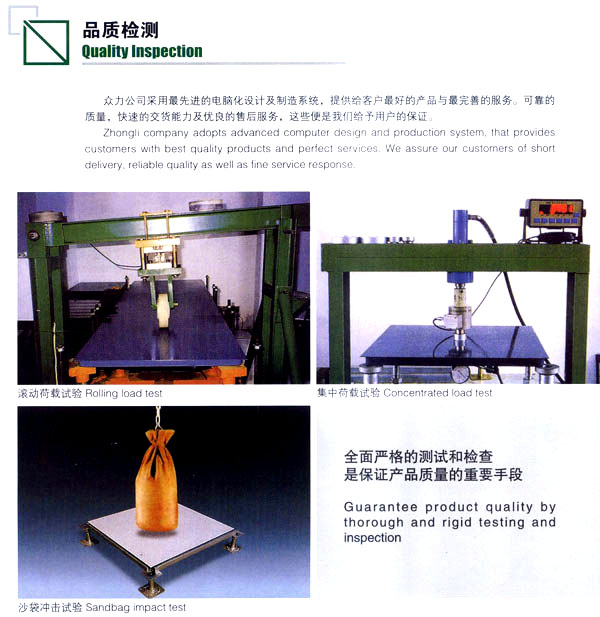 公司生產(chǎn)防靜電鋼質(zhì)、木質(zhì)機房地板和強化復合地板及各種電腦操作臺系列產(chǎn)品。該產(chǎn)品廣泛應用于電子機房、通訊機房、各類實驗室和管線鋪設集中的防靜電場所以及家庭、大型商場的裝飾。公司技術力量雄厚、管理科學,已具有設計、開發(fā)、市場營銷及售后服務的專業(yè)人才隊伍。