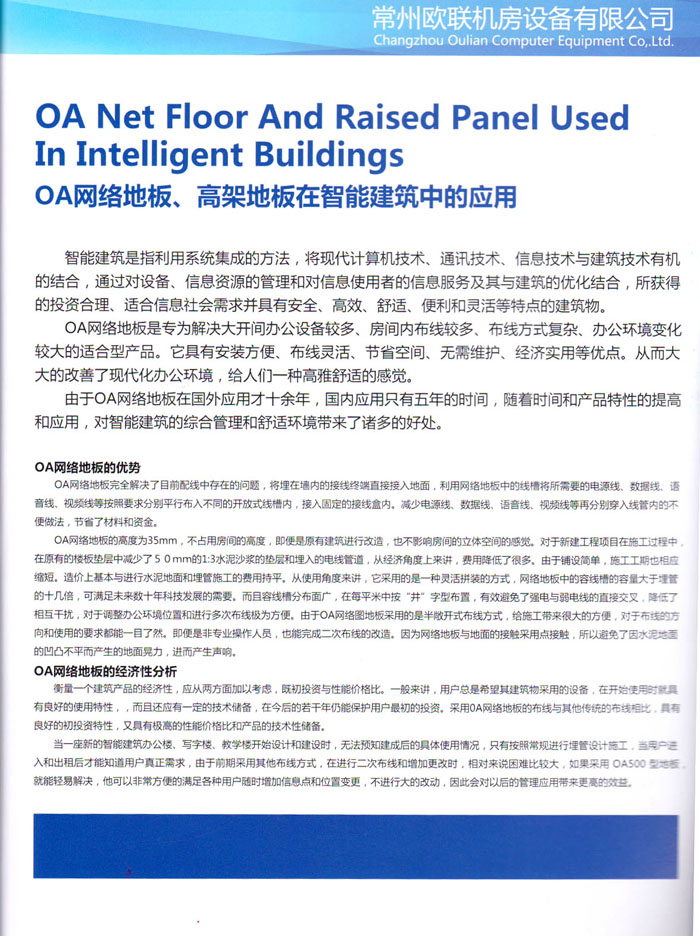 防靜電高架活動(dòng)地板、全鋼地板、陶瓷地板是計(jì)算機(jī)行業(yè)發(fā)展起來的新型鋪地材料,隔離了潮氣、靜電灰塵,最重要的是解決了綜合布線問題,無需預(yù)埋管線,可隨時(shí)拆卸、搬移,保證了資訊設(shè)備完整的優(yōu)點(diǎn),適應(yīng)了智能化樓宇中信息自動(dòng)化技術(shù)對(duì)所處環(huán)境的特定要求,避免了廣大客戶的雙重投資,使現(xiàn)代化辦公程度更加高效,辦公場(chǎng)所更加舒適。 “歐聯(lián)”系列全鋼地板,符合國家安全要求,種類完備多樣,其中防靜電陶瓷地板、硫酸鈣地板等除具有普通瓷質(zhì)的裝飾和實(shí)用性外,其耐磨、防水、防火功能優(yōu)于其它同類產(chǎn)品,防靜電系列地板,能切合不同客戶的要求,其靈活的配置,深受客戶歡迎,不同材質(zhì)的地板結(jié)構(gòu)使設(shè)計(jì)師的設(shè)計(jì)空間比傳統(tǒng)的更加廣闊自由和善變。 公司大力發(fā)展國內(nèi)外銷售業(yè)務(wù),多次中標(biāo)國內(nèi)重點(diǎn)工程 ,例:哈爾濱醫(yī)科大學(xué)、山東大學(xué)、上海普通機(jī)場(chǎng)等。 公司將一如既往開發(fā)和制造一流的產(chǎn)品,愿與廣大有識(shí)之士合作發(fā)展,共創(chuàng)美好未來。